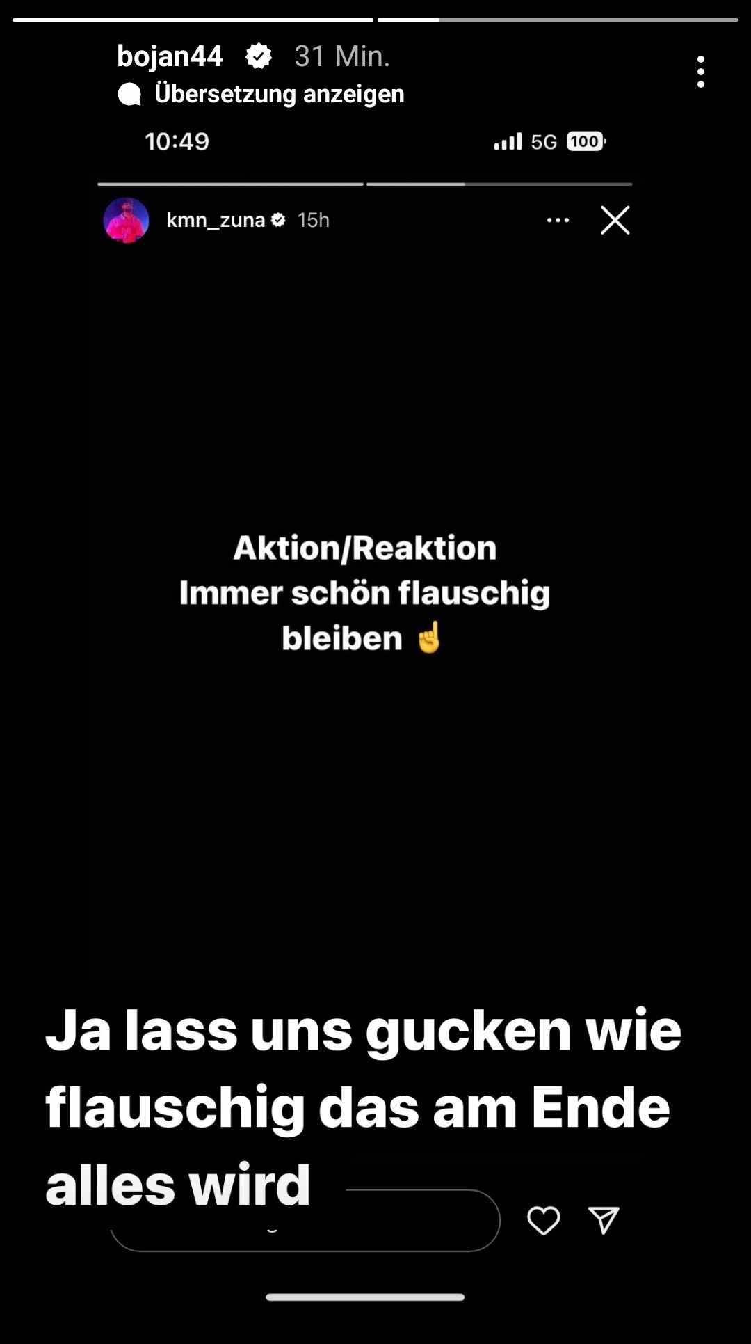 Anschließend repostet er Zunas Story und schreibt dazu: