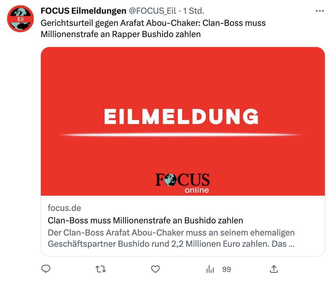 „Der Kläger (Arafat Abou-Chaker) wurde durch das Versäumnisurteil zur Zahlung eines Betrags in Höhe von 2.205.658,87 Euro nebst Zinsen an den Beklagten (Bushido) verurteilt“