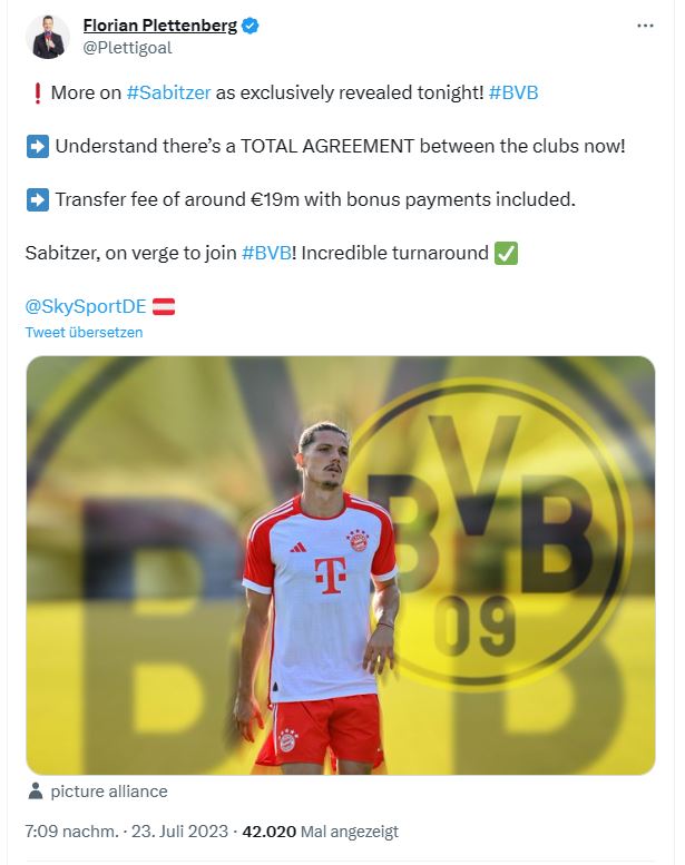 Borussia Dortmund soll dem FC Bayern München demnach bis zu 19 Millionen Euro (Boni inklusive) für Marcel Sabitzer überweisen.