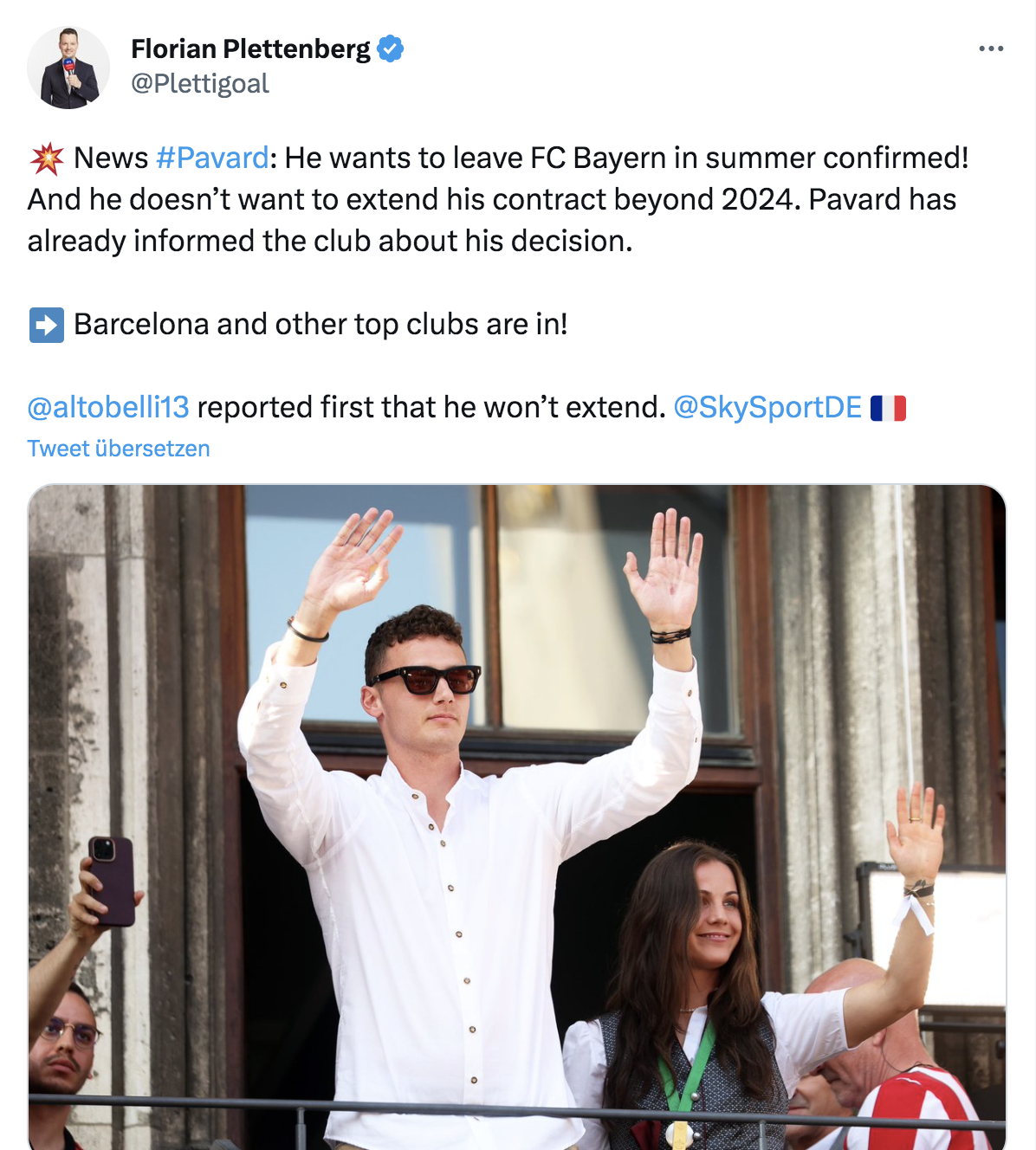 Wie Sky berichtet, soll der Klub darüber informiert sein und Pavard in dieser Transferperiode verkaufen, um ihn nicht 2024 ablösefrei zu verlieren.