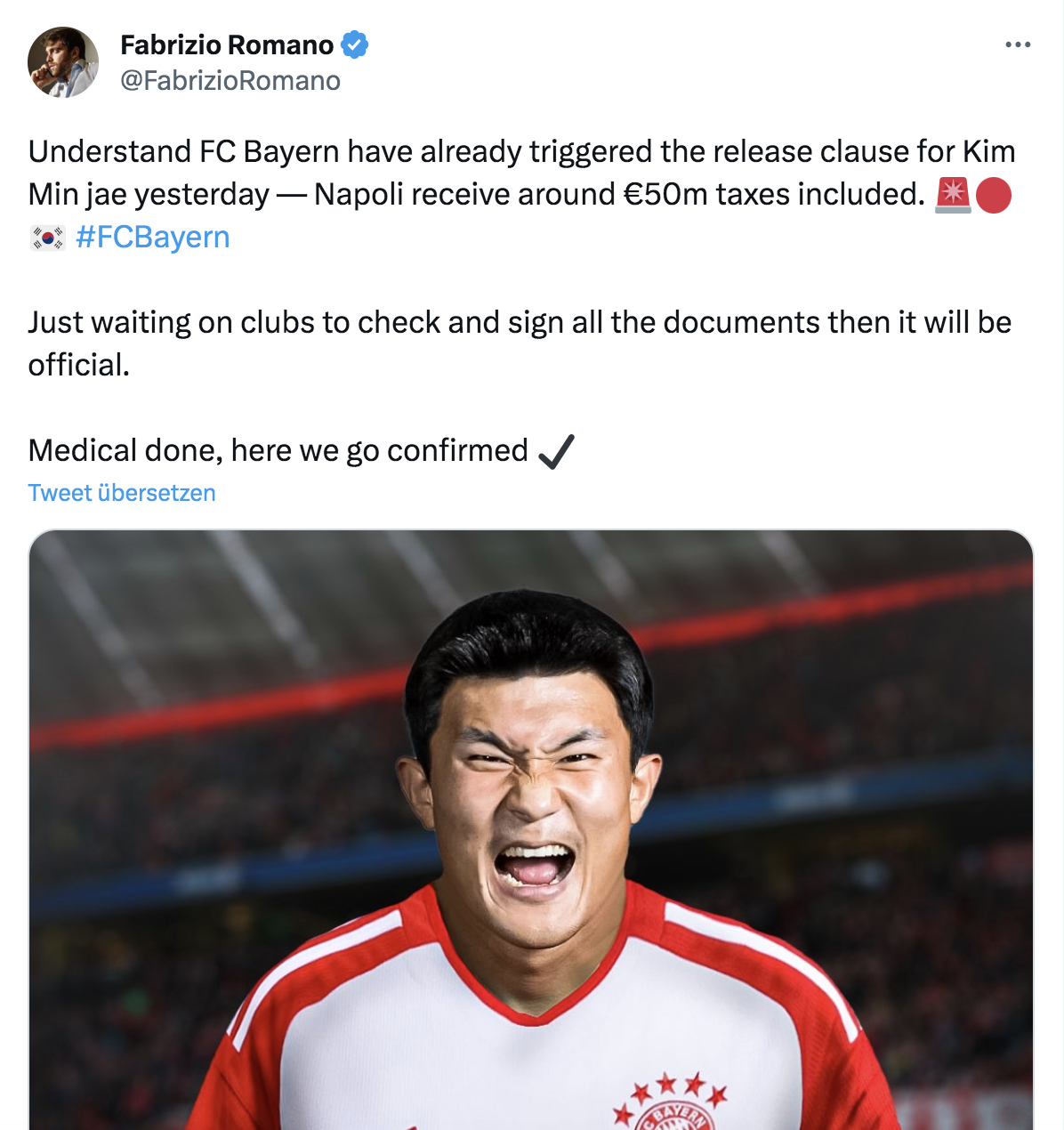 Soeben kommt das berühmte „Here We Go“ von Transfer-Guru Fabrizio Romano. Der Deal ist endgültig durch, der Spieler wechselt zu Bayern!