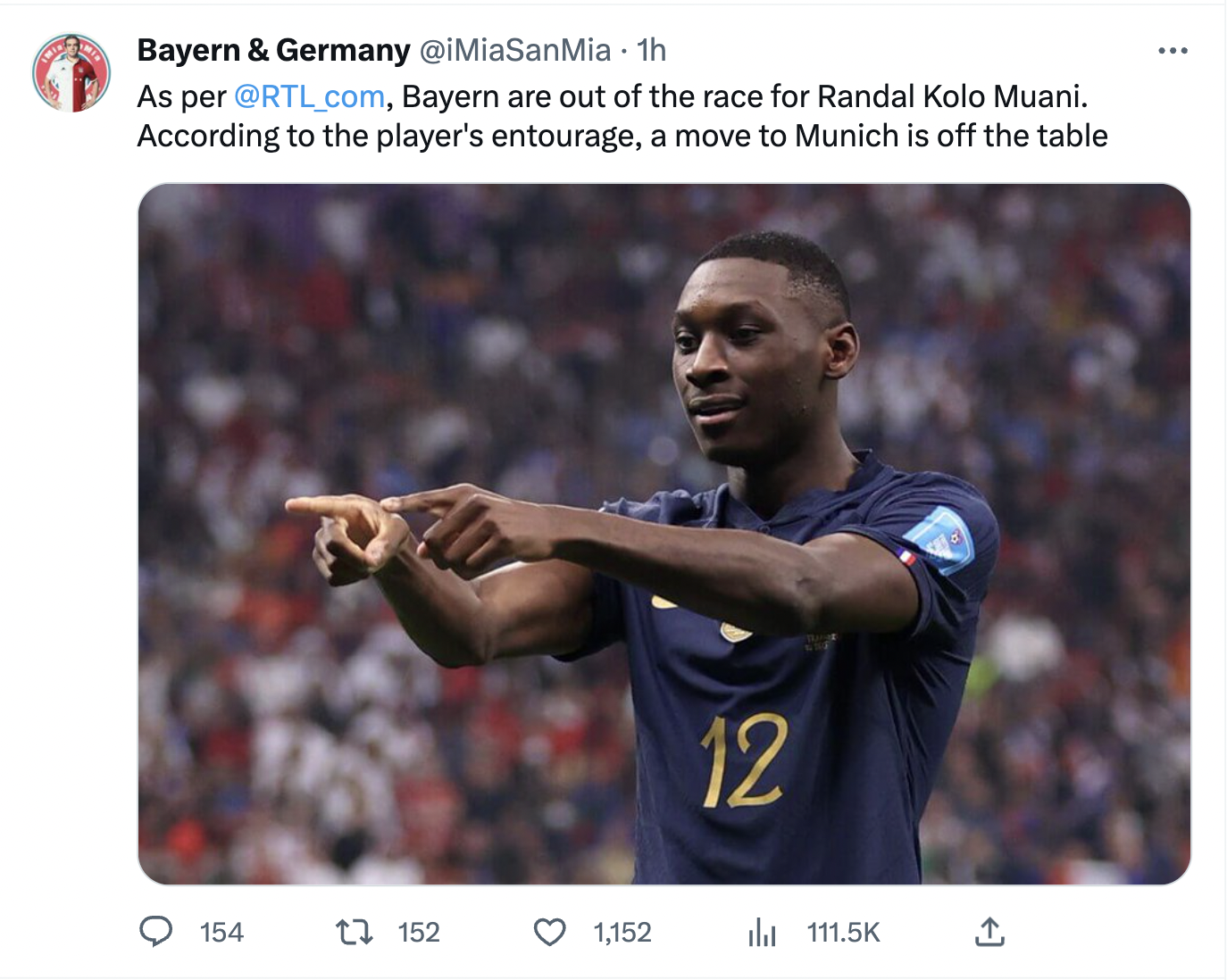 RTL will aus dem Umfeld von Kolo Muani erfahren haben, dass der FC Bayern in den Planungen des Spielers KEINE Rolle spielt.
