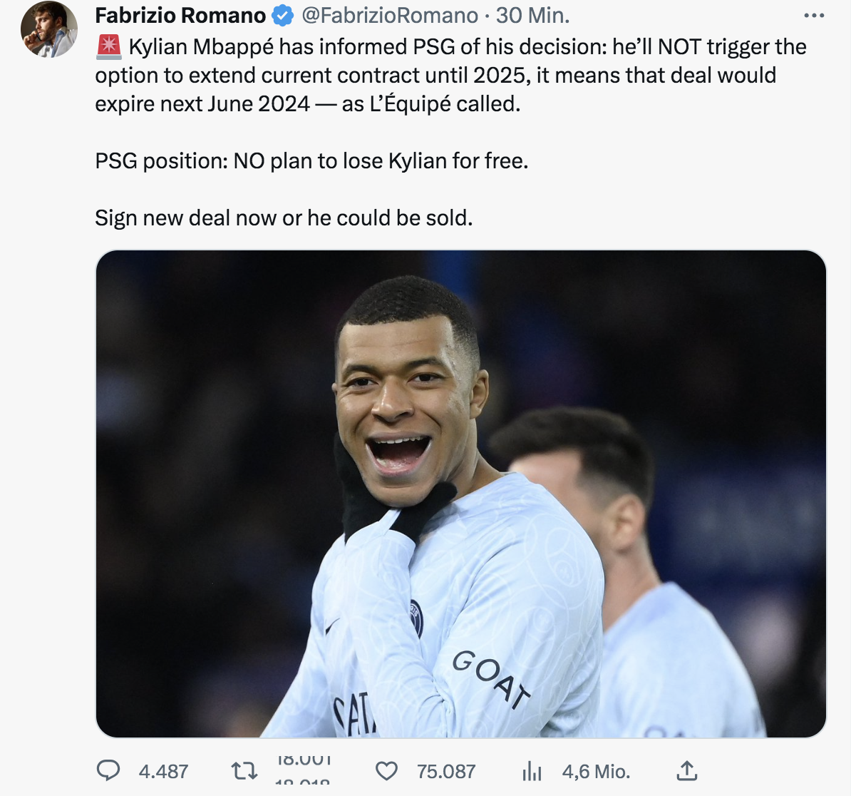 Heißt: Mbappe ist plötzlich Verkaufs-Kandidat. Und der größte Interessent ist natürlich: