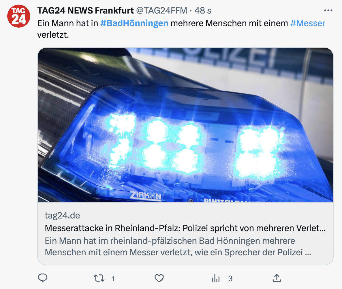 Es passiert am frühen Samstag Abend im kleinen Ort Bad Hönningen (Rheinland-Pfalz). Ein Unbekannter greift plötzlich mit einem Messer mehrere Personen an, ein Mensch stirbt!