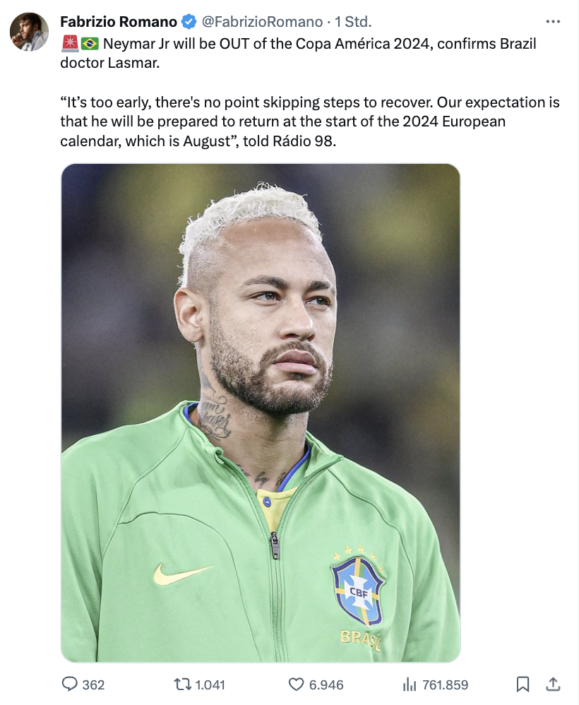Nach der verpassten Copa America im Jahr 2019 und der enttäuschenden WM in Katar verpasst Neymar auch das nächste große Turnier mit Brasilien!