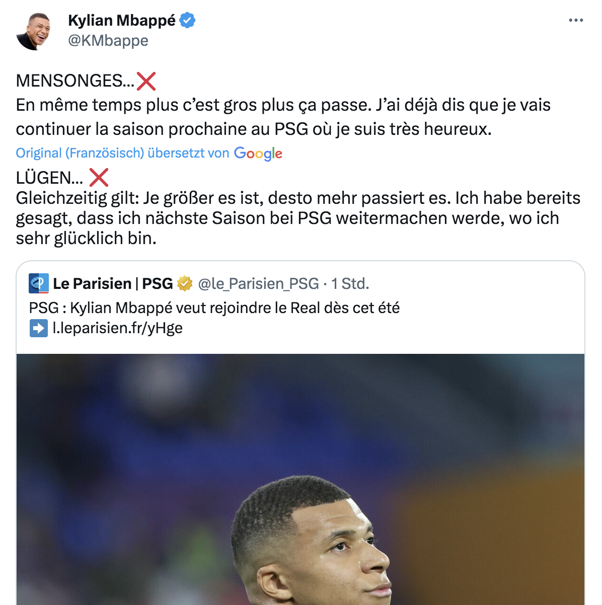 Es ist sein Reaktion auf einen Artikel, in dem steht: Mbappe will diesen Sommer zu Real.