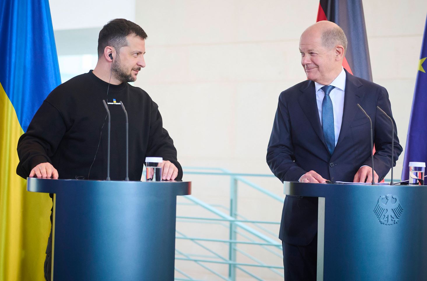 Dann nickt er in Richtung Scholz und sagt mit Blick auf das neueste Waffenpaket: