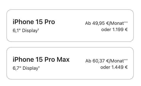 Für das billigste iPhone 15 Pro werden 1.199 Euro fällig, für das große iPhone 15 Pro Max hingegen satte 1.449 Euro!