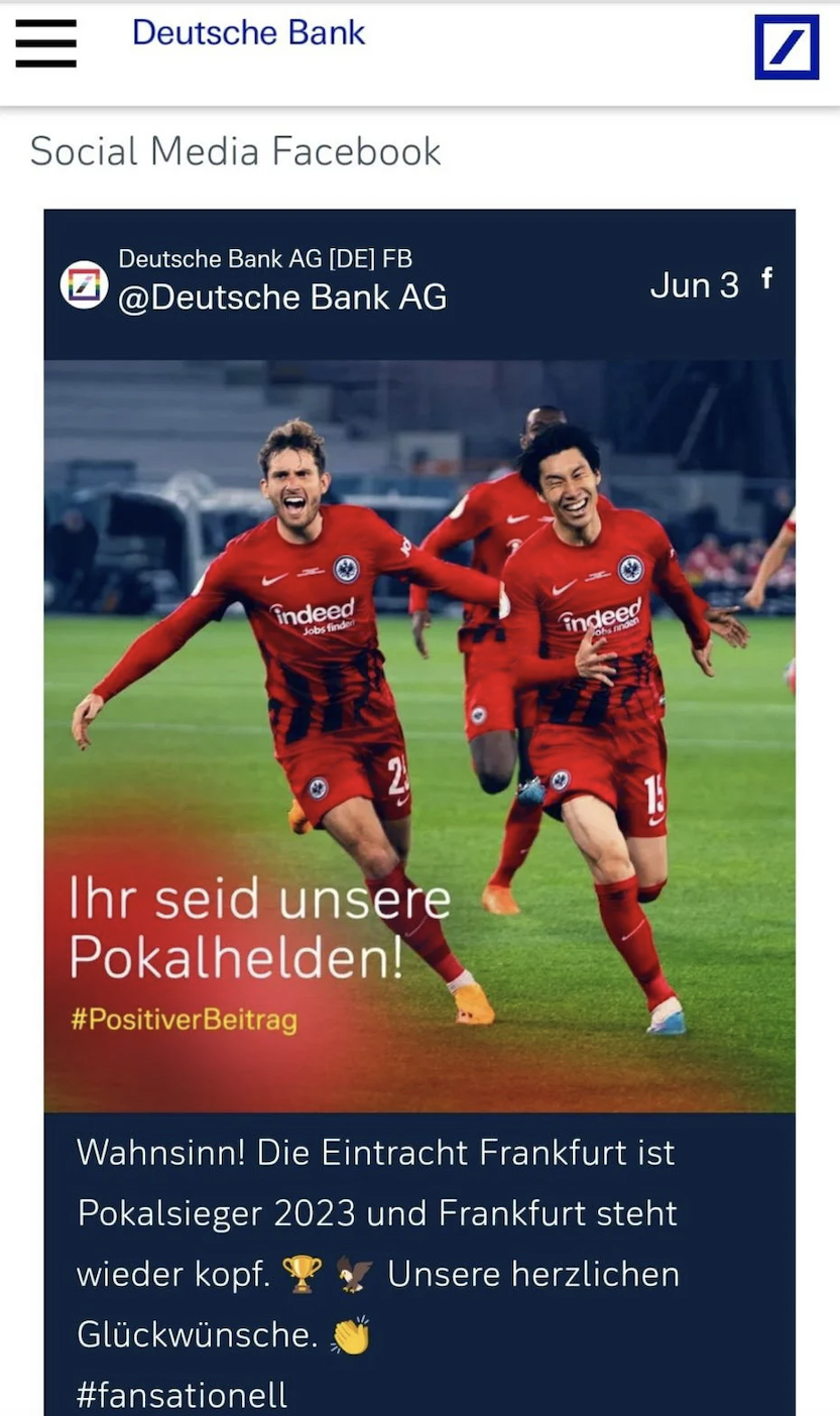 Die Deutsche Bank sorgt nach dem Pokalfinale für eine Überraschung in den sozialen Medien. Trotz der Frankfurt-Niederlage postet der Sponsor: