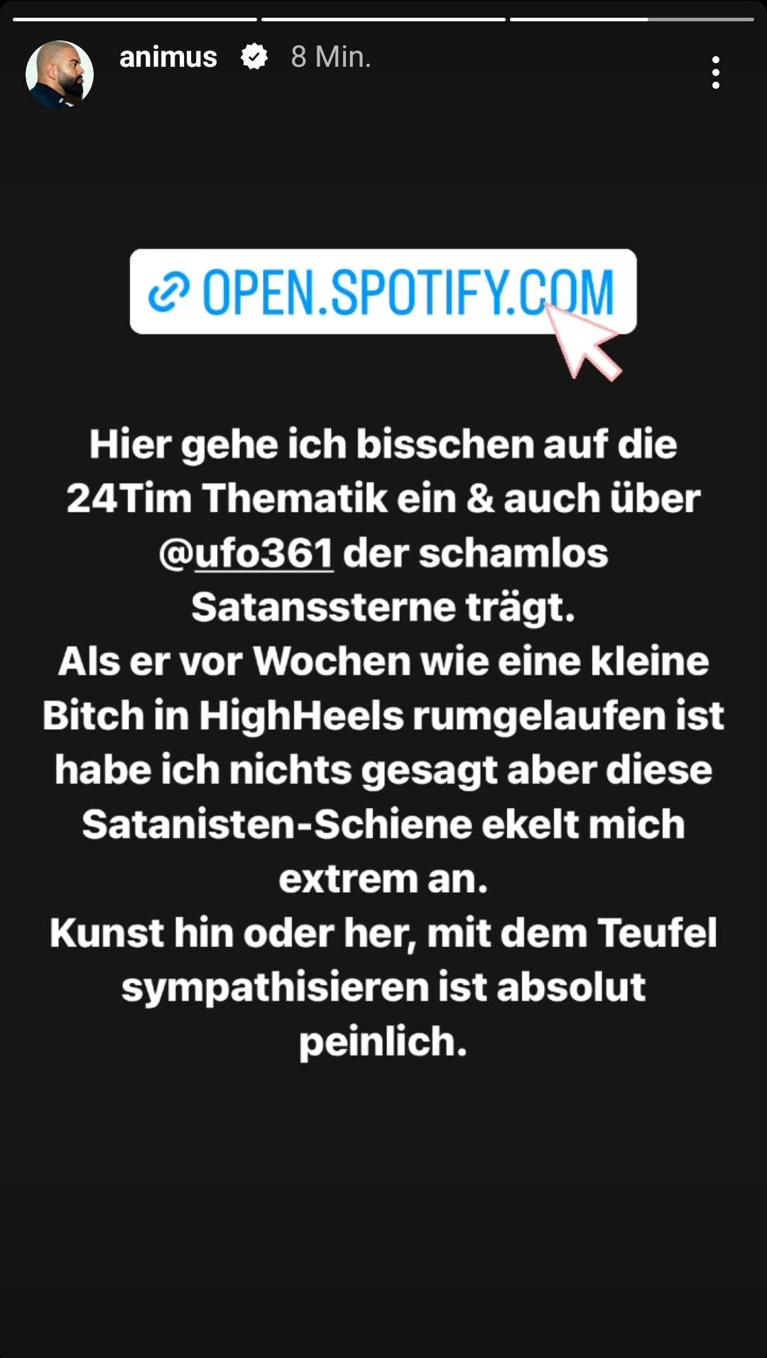 „Ufo361, der schamlos Satanssterne trägt. Als er vor Wochen wie eine kleine Bitch in High-Heels rumgelaufen ist, habe ich nichts gesagt, aber diese Satanisten-Schiene ekelt mich extrem an.
