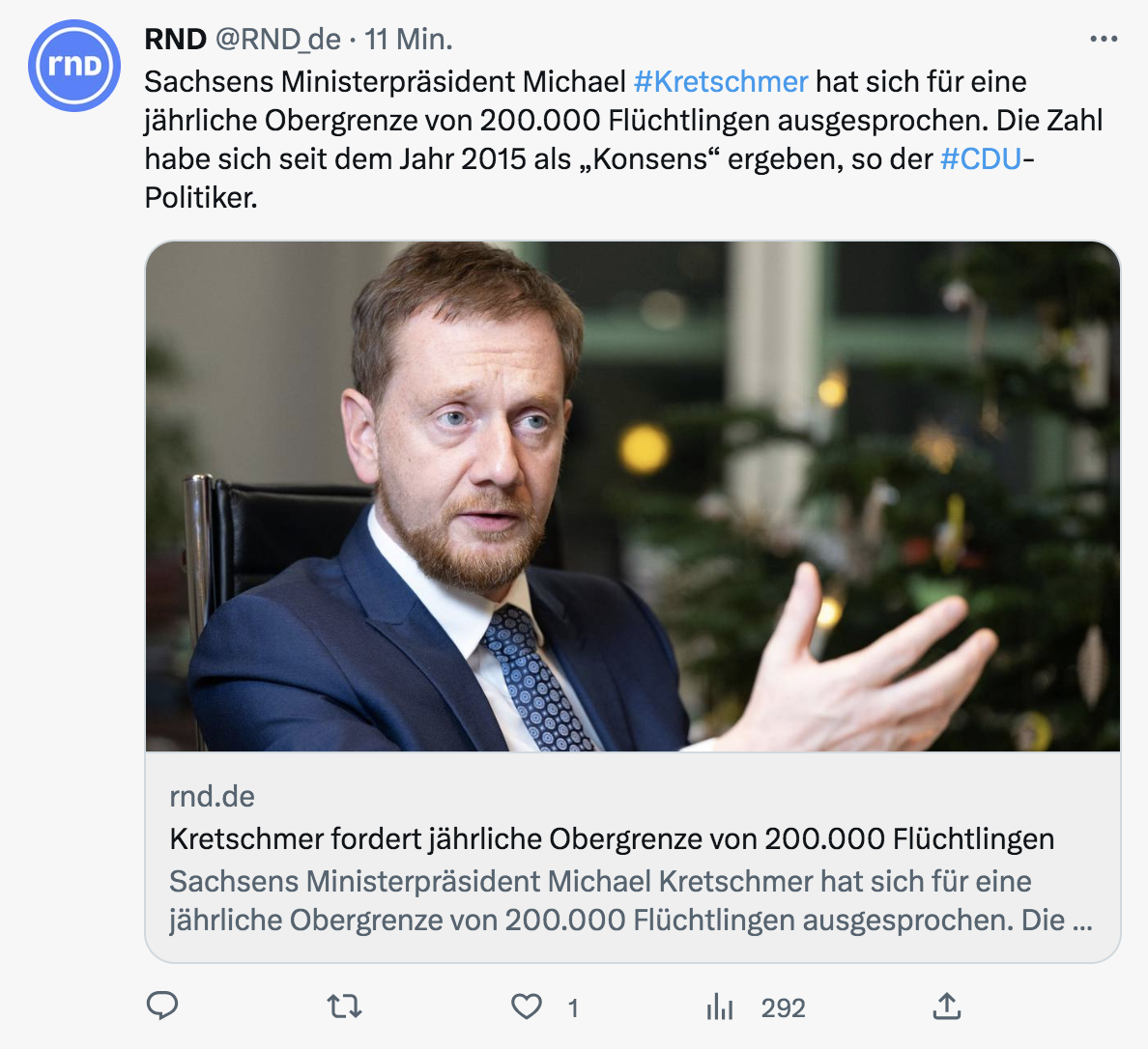 Der sächsische Minister-Präsident Michael Kretschmer sorgt sich vor einer Spaltung der Gesellschaft. Daher möchte er die Anzahl der Asyl-Anträge begrenzen.