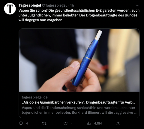 „Die aggressive Bewerbung von E-Zigaretten mit Toffee-, Kirsch- oder Minzaromen animiert Jugendliche zum Rauchen. Zusätzlich werden sie durch preisgünstige Einweg-E-Zigaretten angesprochen.