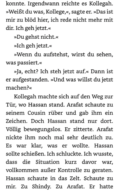 „Kollegah machte sich auf den Weg zur Tür, wo Hassan stand. Arafat schaute zu seinem Cousin rüber und gab ihm ein Zeichen. Doch Hassan stand nur dort.