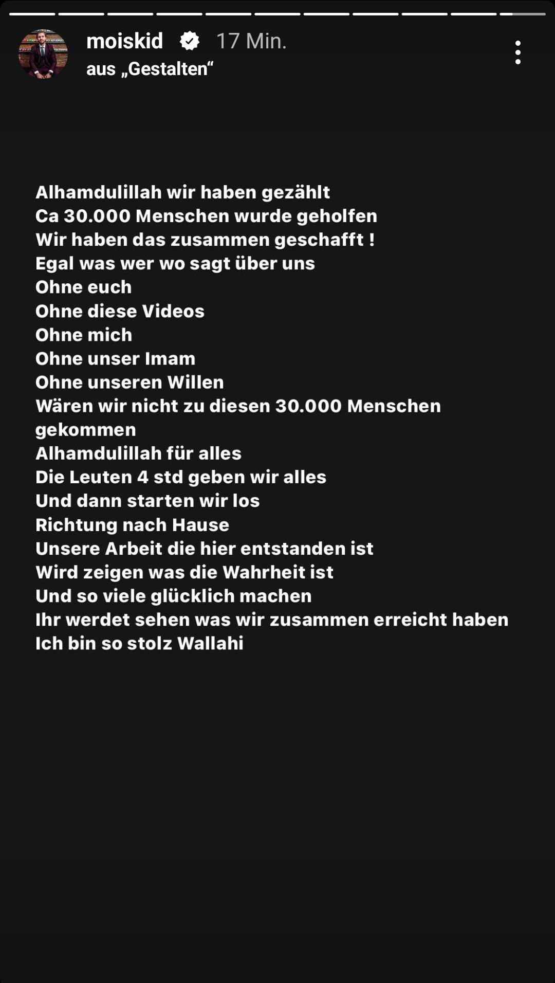 „Alhamdulillah, wir haben gezählt. Ca 30.000 Menschen wurde geholfen. Wir haben das zusammen geschafft! Egal was wer wo sagt über uns – Ohne euch, ohne diese Videos, ohne mich, ohne unser Imam, ohne unseren Willen wären wir nicht zu diesen 30.000 Menschen gekommen“