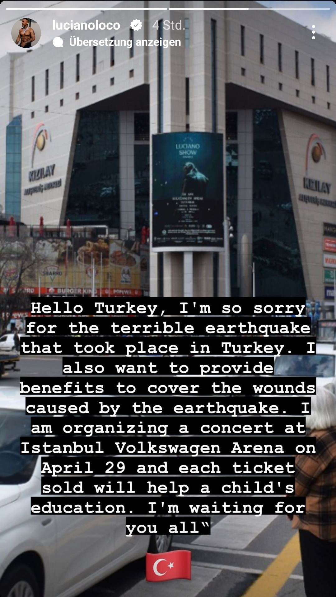 „Hallo Türkei. Mein tiefstes Beileid für das Erdbeben, welches ihr erleben musstet. Ich möchte dabei helfen, die Wunden des Erdbebens zu schließen.