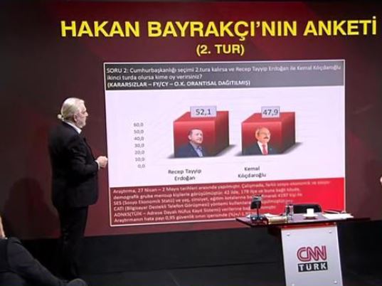 Bei CCN Turk stellt Bayrakci die aktuellen Werte vor und ist sich sicher, dass Präsident Erdogan spätestens in der zweiten Runde gewinnen wird.