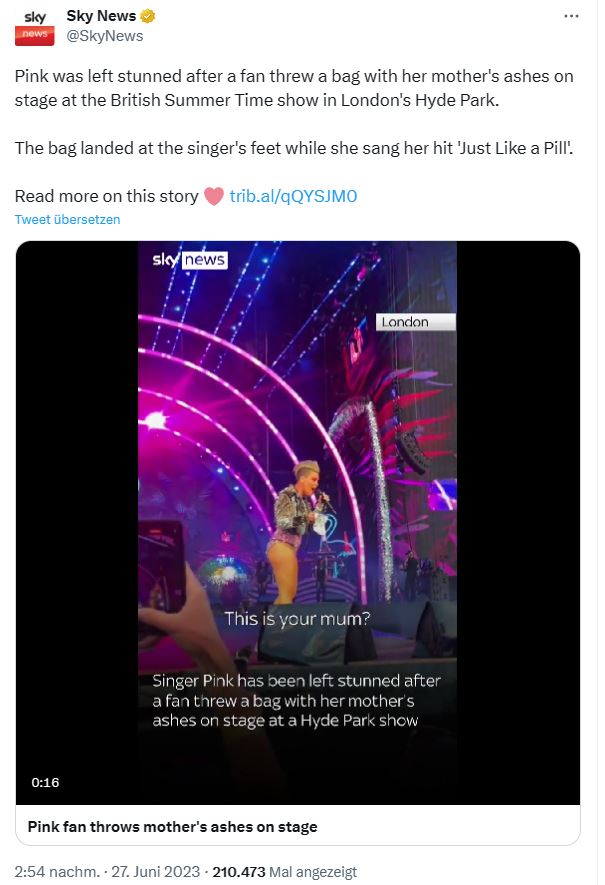 Es passiert beim BST-Festival im Londoner Hyde Park. Alecia Moore alias Pink singt gerade ihren Hit „Just like a Pill“.