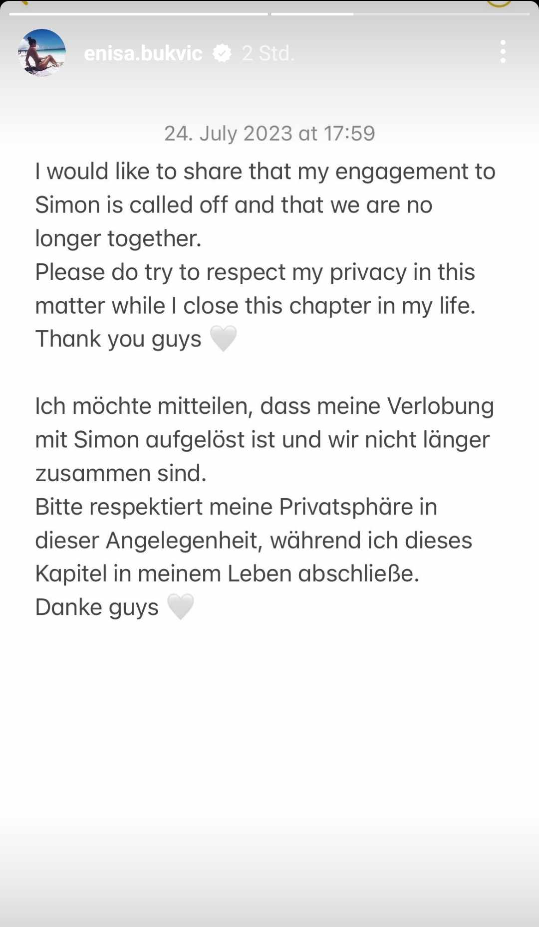 „Ich möchte mitteilen, dass meine Verlobung mit Simon aufgelöst ist und wir nicht länger zusammen sind. Bitte respektiert meine Privatsphäre in dieser Angelegenheit, während ich dieses Kapitel in meinem Leben abschließe“