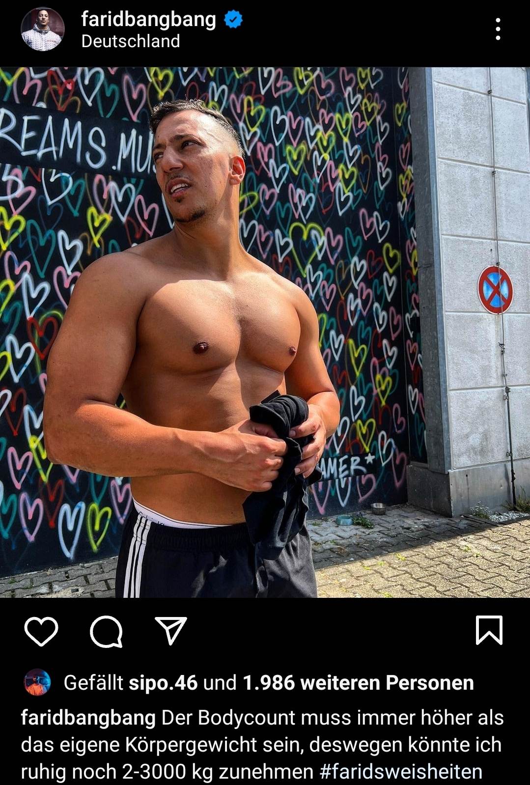 Unter seinem neuesten Instagram-Bild schreibt Farid, dass die Anzahl der Sex-Partner immer höher sein muss, als das Körpergewicht.