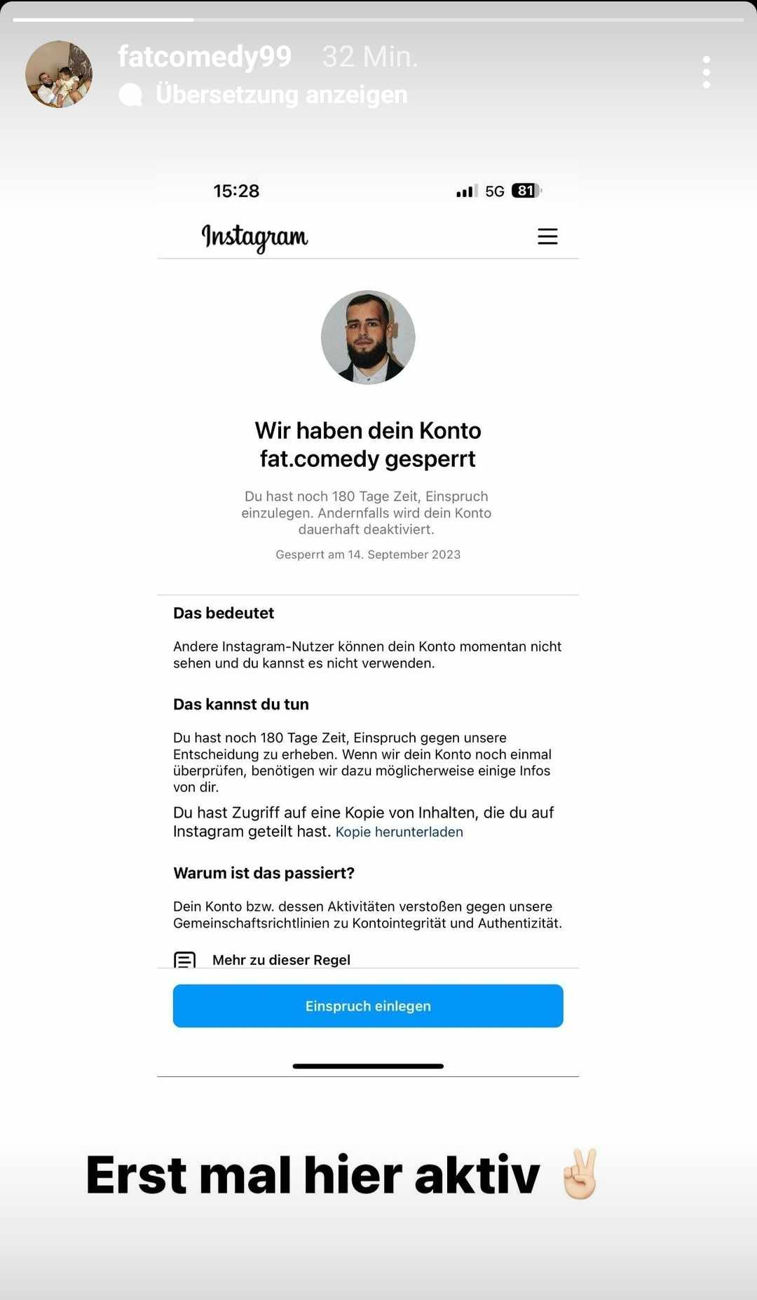 Auf seinem zweiten Profil zeigt der Entertainer, dass Instagram sein Hauptaccount gesperrt hat.