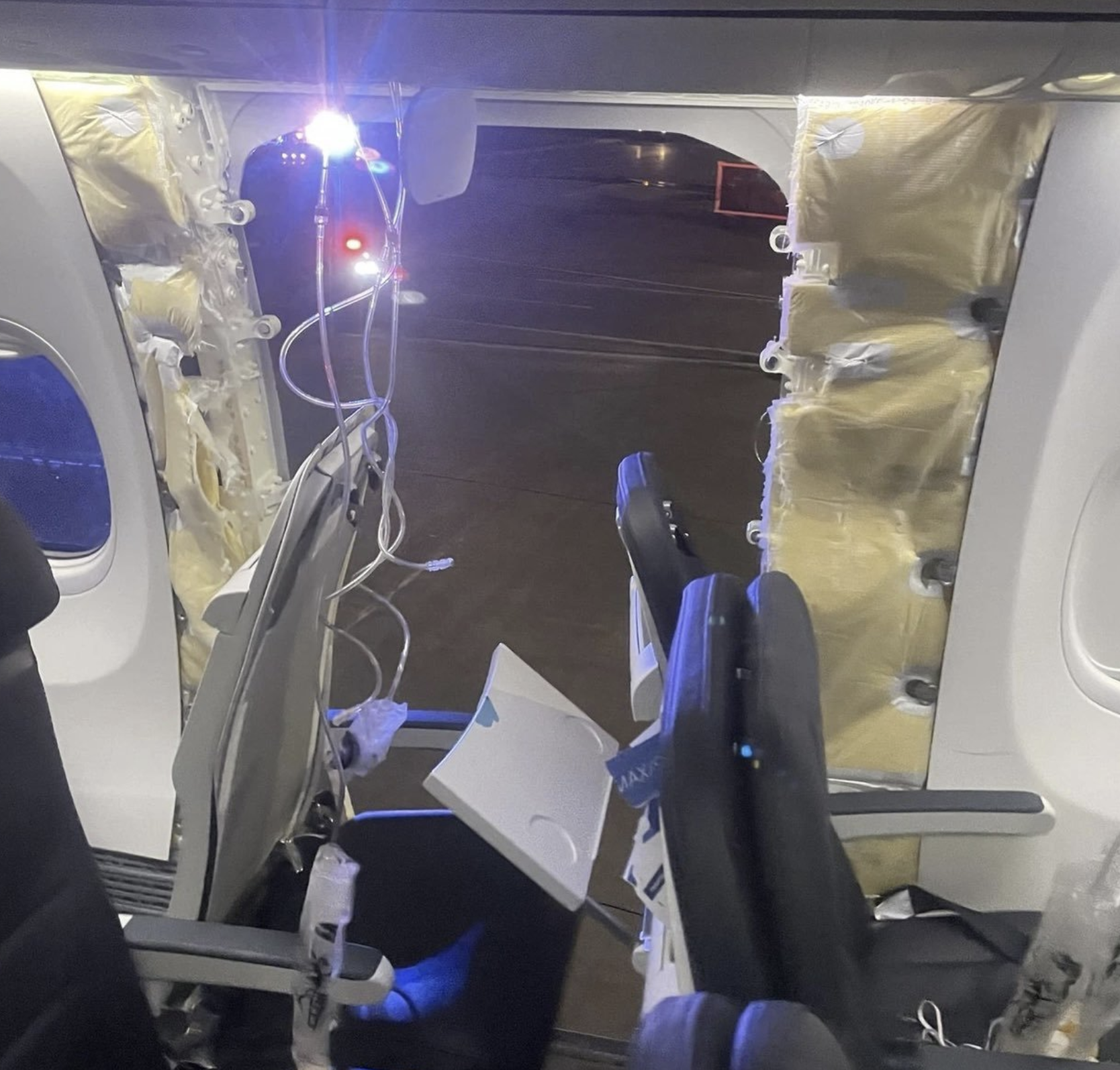 Auf der sozialen Medien-Plattform X gibt es sogar Videos aus der Luft, wie die Maschine des Types Boeing 737-MAX 9 mit offener Tür über die Stadt fliegt!