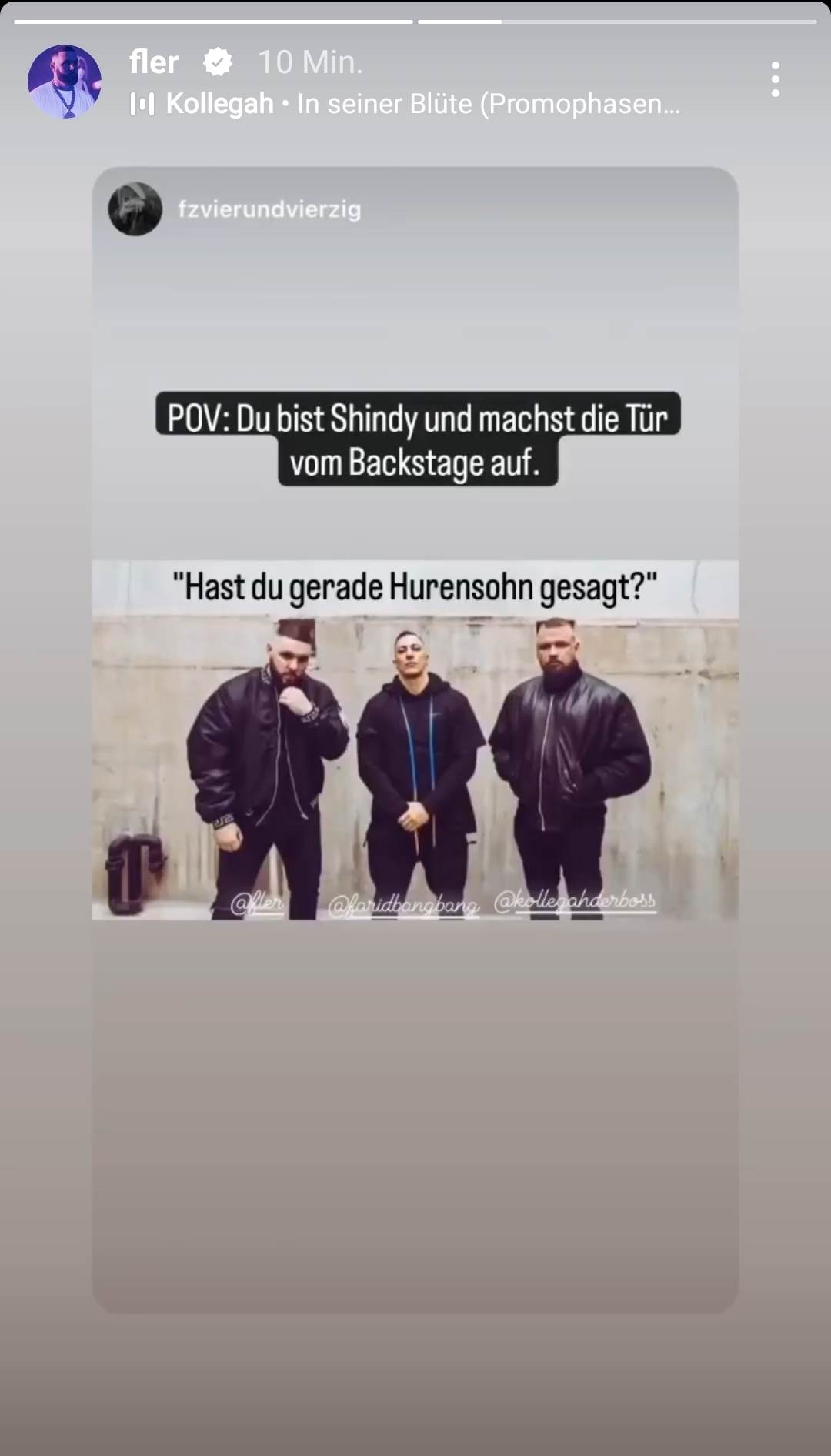 In seiner Instagram-Story teilt Fler ein Bild, auf welchem er, Farid und Kollegah stehen. Daneben steht: