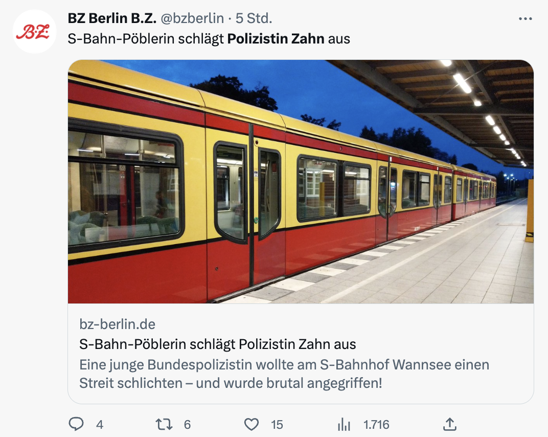 Eine Bundespolizistin (23) – gerade auf dem Weg zum Dienst – geht dazwischen. Sie kriegt sofort eine Faust ins Gesicht, ein Schneidezahn ist raus!