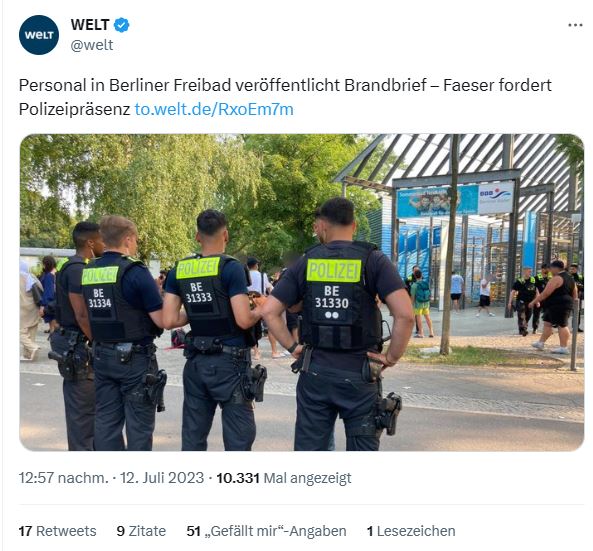 In Berlin sogar schon in dieser Woche. Auch heute sind Beamte auf Streife in den Bädern unterwegs. Kollegen in zivil mischen sich ebenfalls unter die Badegäste.