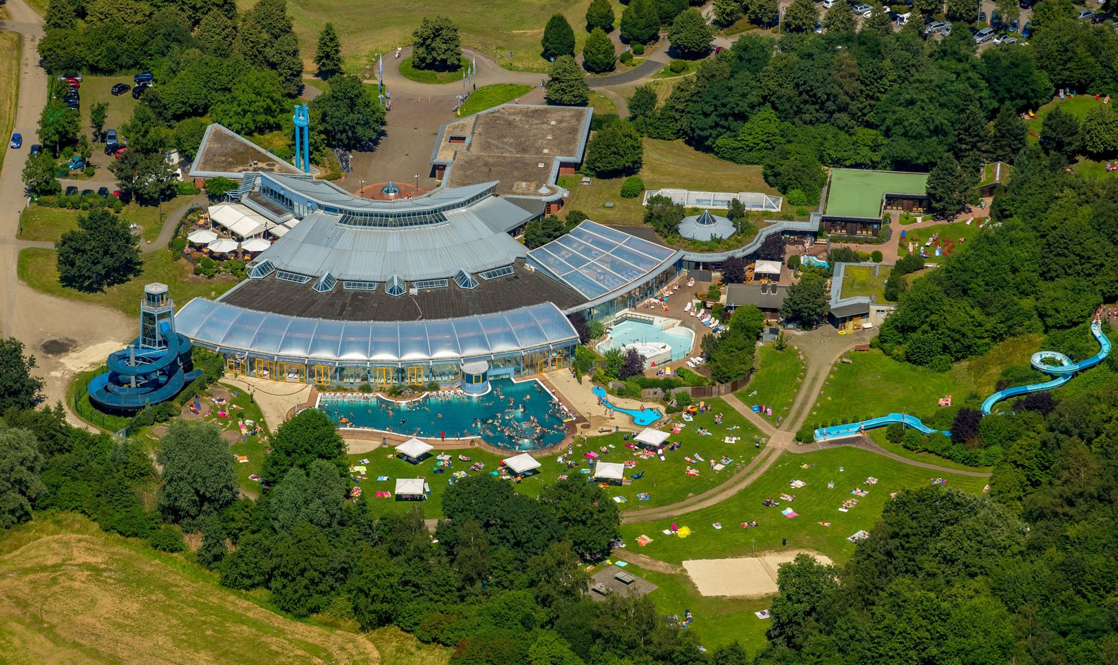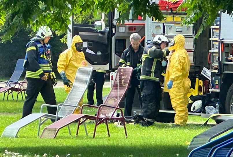 Unglaubliche Bilder aus dem Freizeitbad Heveney. Wo sich sonst Menschen auf der Wiese bräunen, gehen am Samstagmorgen Feuerwehrmänner in Spezialanzügen auf und ab.