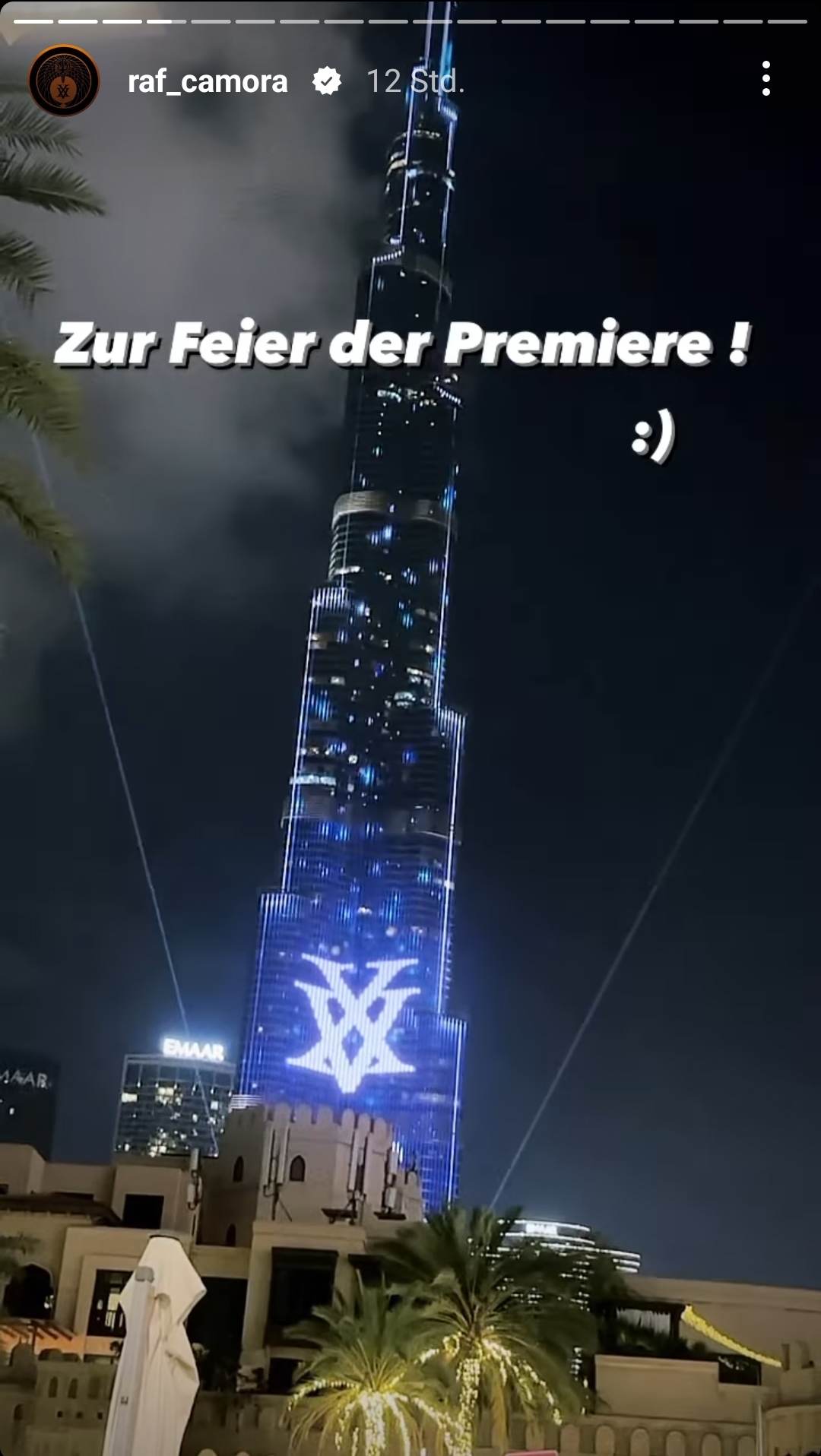 In seiner Instagram-Story zeigt RAF Camora, dass um Mitternacht deutsche Zeit plötzlich das Logo zu seinem kommenden Album „XV“ auf dem Turm zu sehen war.