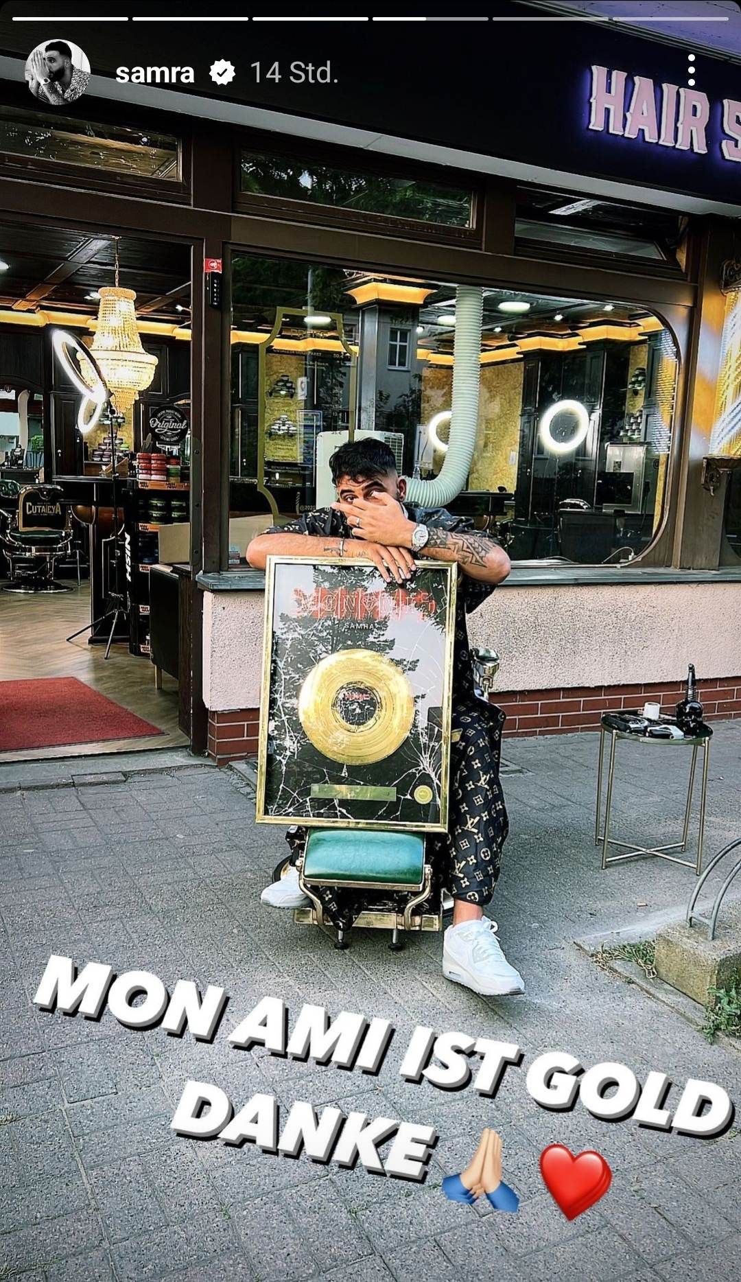 In seiner Instagram-Story zeigt der Berliner Künstler, dass sein Song „Mon Ami“ die 200.000 Einheiten abgesetzt und somit den Goldstatus geknackt hat.