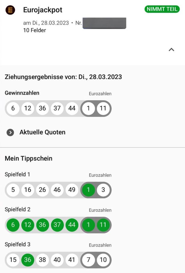 Dort zu sehen sind die fünf richtigen Gewinn-Zahlen und zusätzlich auch noch beide Eurozahlen. Sollte der Schein echt sein, wären das 73,8 Millionen (!!!) Euro.