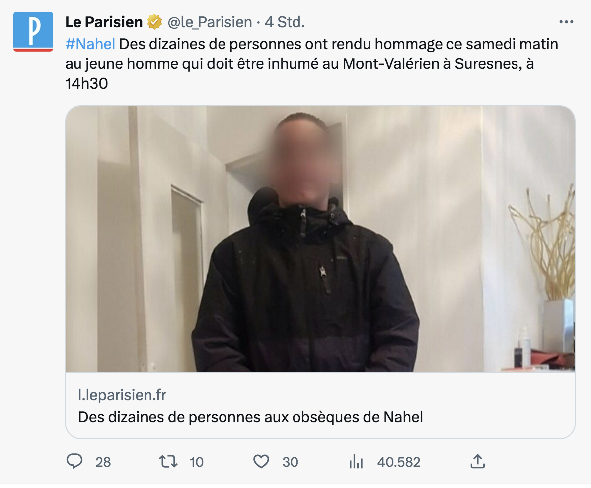 Um 13.30 Uhr werden in der Ibn-Badis-Moschee in Nanterre Trauergebete abgehalten, bevor Nahel um 14.30 Uhr auf dem Friedhof Mont Valérien zu Grabe getragen wird.