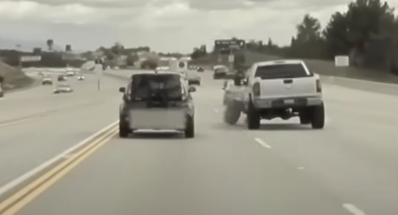 Plötzlich löst sich der vordere linke Reifen des Pick-Ups und gerät genau unter den KIA.