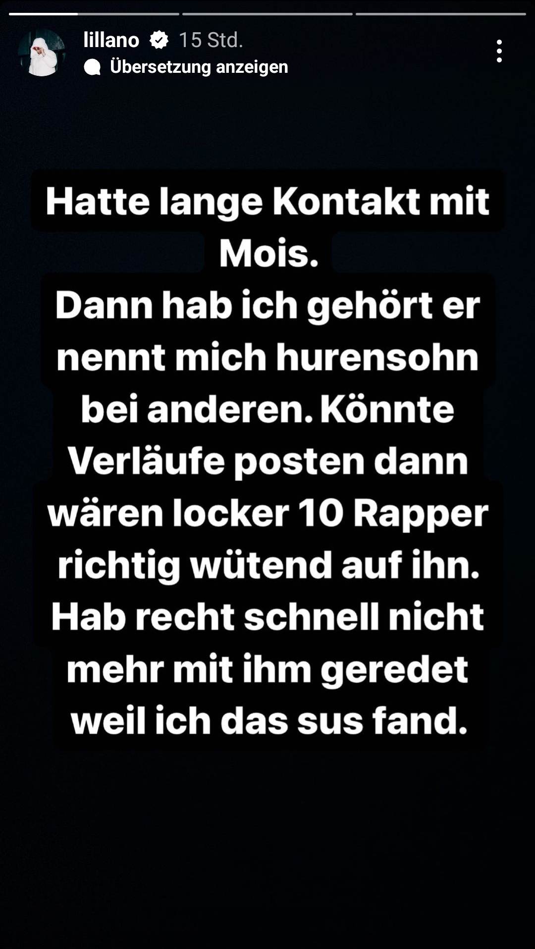 „Hatte lange Kontakt mit Mois. Dann habe ich gehört er nennt mich Hurensohn bei Anderen. Könnte Verläufe posten, dann wären locker 10 Rapper richtig wütend auf ihn.