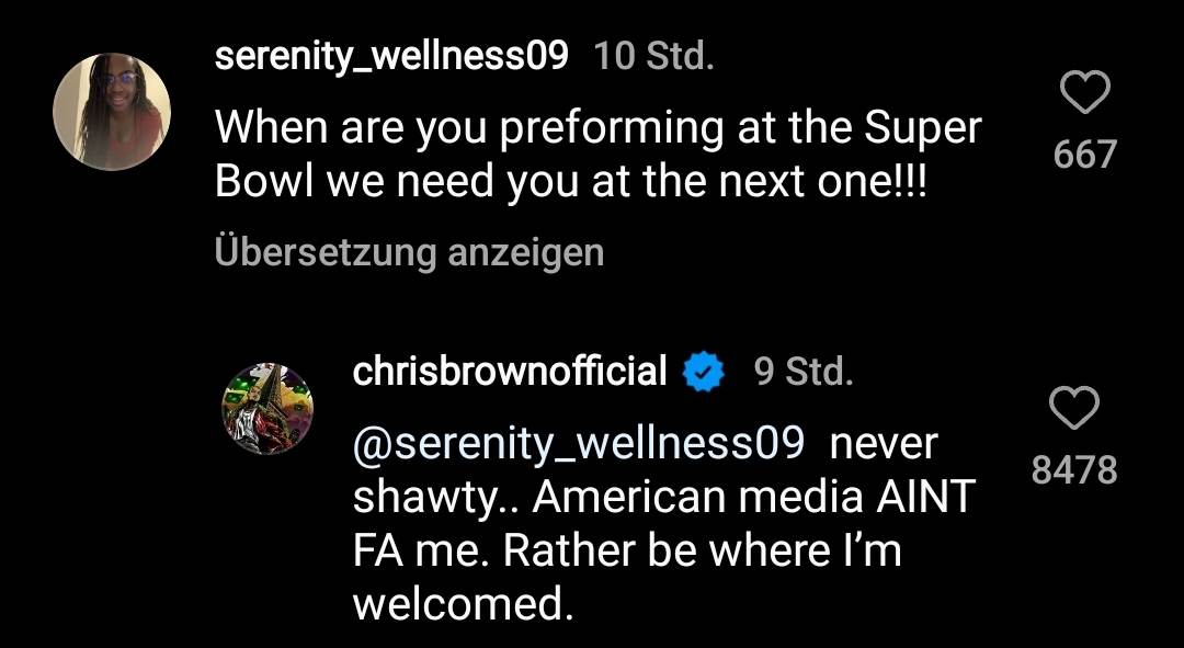 Auf Instagram erkundigt sich ein User, wann Chris Brown endlich in der Halbzeit-Show der Super Bowl performen wird. Die Antwort darauf ist eindeutig:
