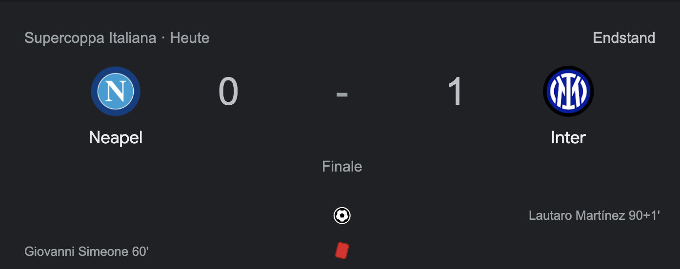 Der Sieger steht fest: Inter Mailand hat am Montag Abend im Finale mit 1:0 gegen den SSC Neapel gewonnen und holt somit den ersten Titel der Saison…