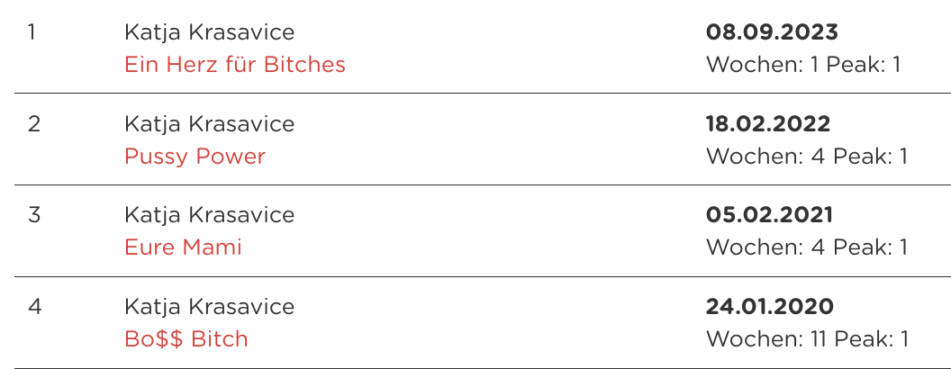 Die deutschen Charts machen es soeben offiziell: „Ein Herz für Bitches“ von Katja Krasavice steigt auf Platz 1 der Album-Charts ein.