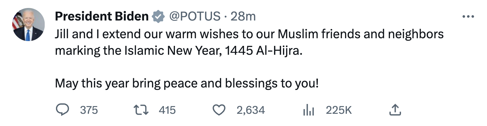 „Jill und ich richten unsere herzlichen Wünsche an unsere muslimischen Freunde und Nachbarn anlässlich des islamischen Neujahrsfestes Al-Hijra 1445. Möge dieses Jahr Ihnen Frieden und Segen bringen“