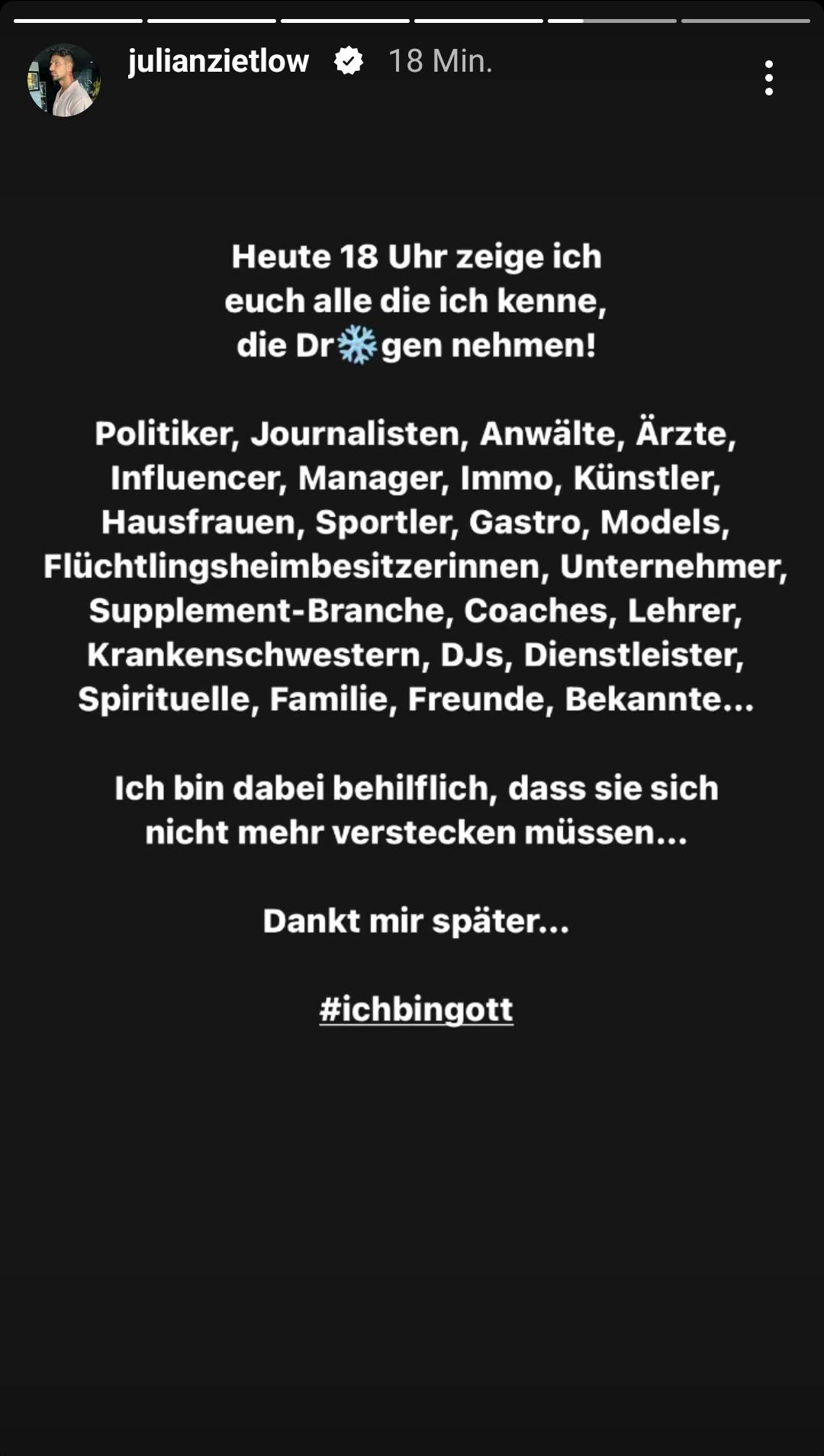 „Heute 18 Uhr zeige ich euch alle die ich kenne, die Drogen nehmen! Ich bin dabei behilflich, dass sie sich nicht mehr verstecken müssen. Dankt mir später #ichbingott“