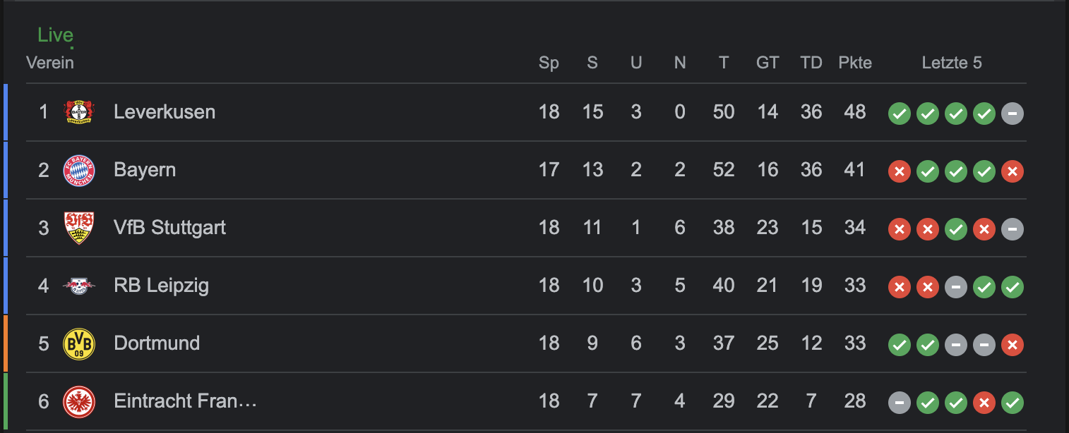 Selbst wenn man das Nachhol-Spiel gegen Union Berlin und zudem das direkte Duell gegen Bayer gewinnen sollte, steht man trotzdem noch einen Punkt hinter der Werkself!