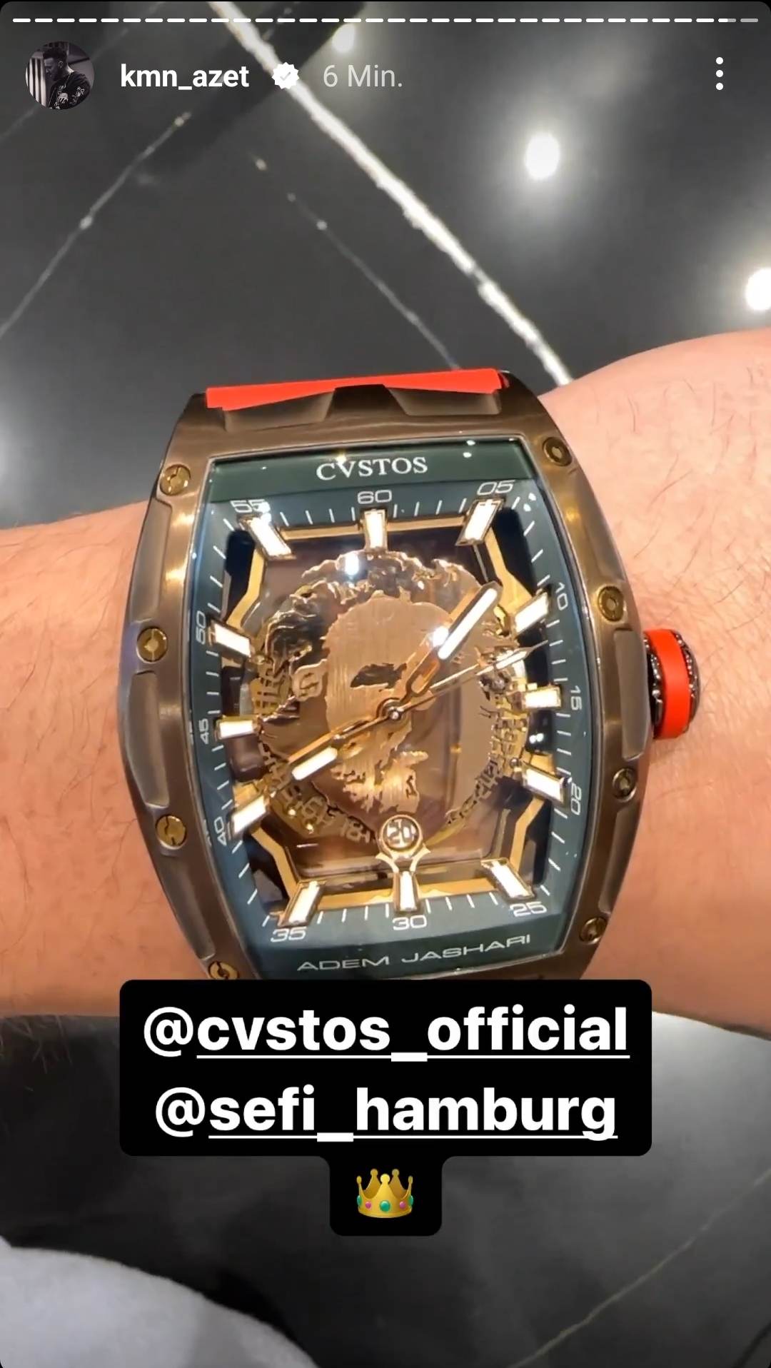 In seiner Instagram-Story zeigt der Platinrapper, dass er eine schicke Cvstos-Uhr von einem Freund geschenkt bekommen hat.