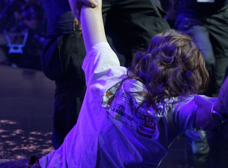 Nach wenigen Sekunden greift die Security ein und bringt die Aktivisten von der Bühne.
