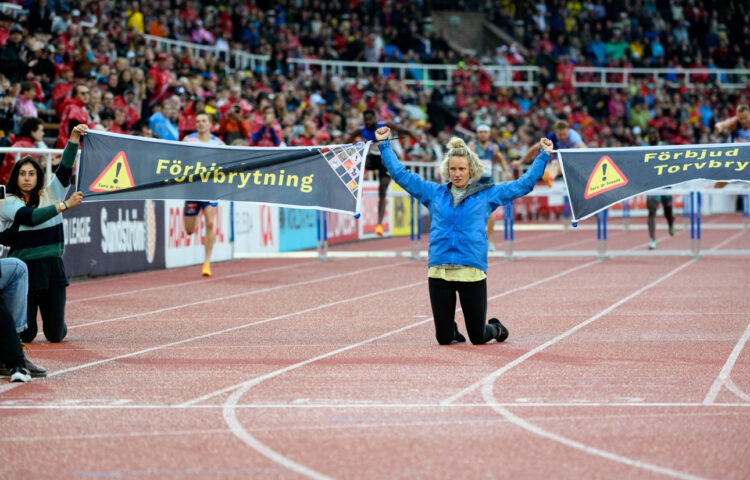 Aktivisten des schwedischen A22-Netzwerks stürmen während der Entscheidung über 400 Meter Hürden die Rundbahn in Stockholm.