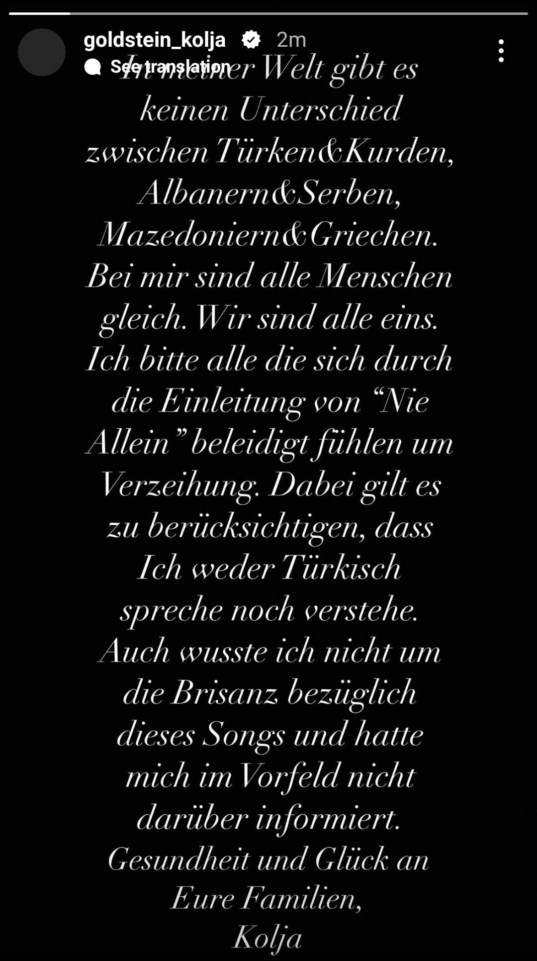 „In meiner Welt gibt es keinen Unterschied zwischen Türken & Kurden (…) Ich bitte alle, die sich durch die Einleitung von ‚Nie allein‘ beleidigt fühlen um Verzeihung.
