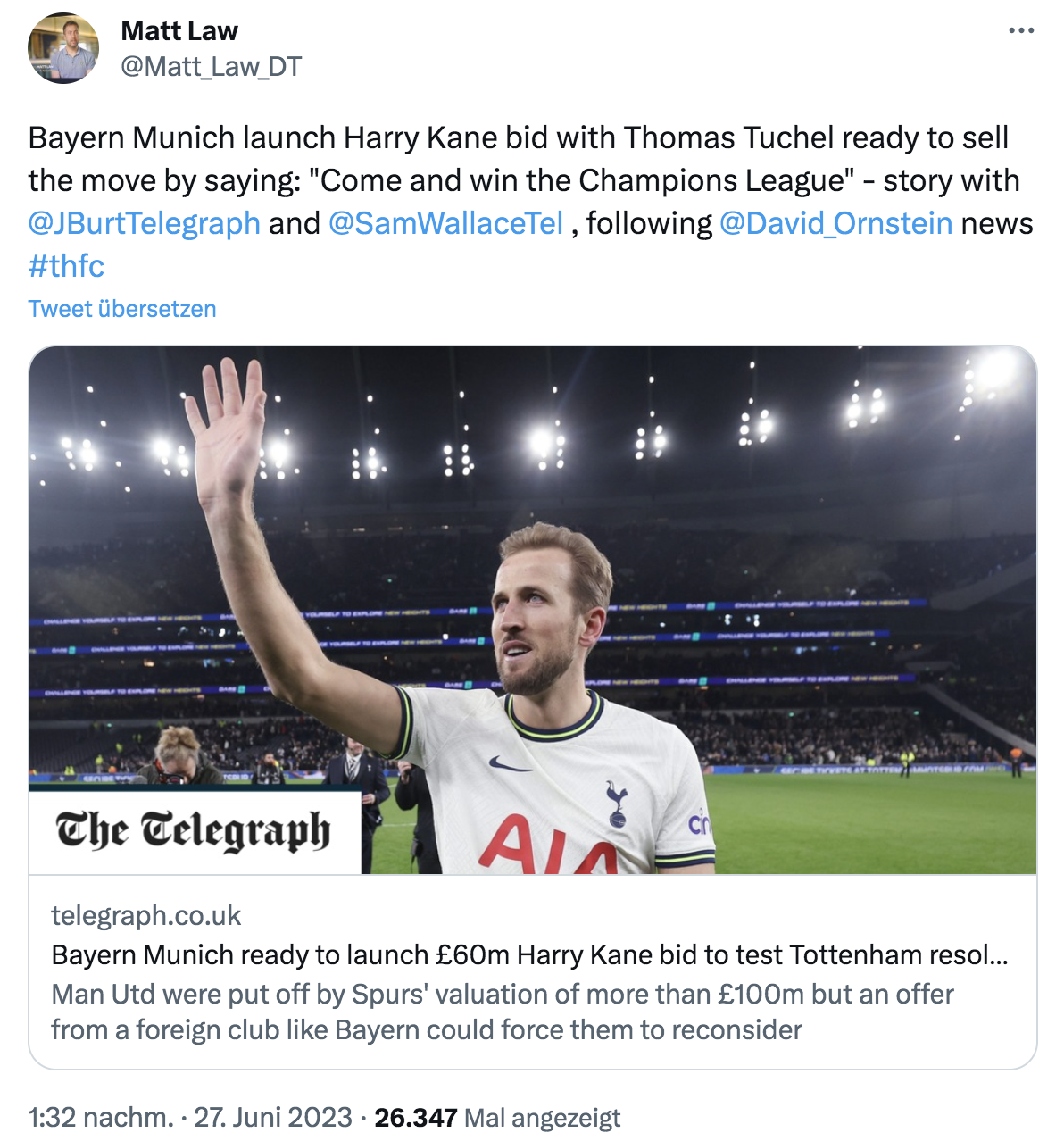 Ein erstes Angebot der Bayern über 70 Millionen plus Boni haben die Spurs innerhalb von Minuten abgelent.