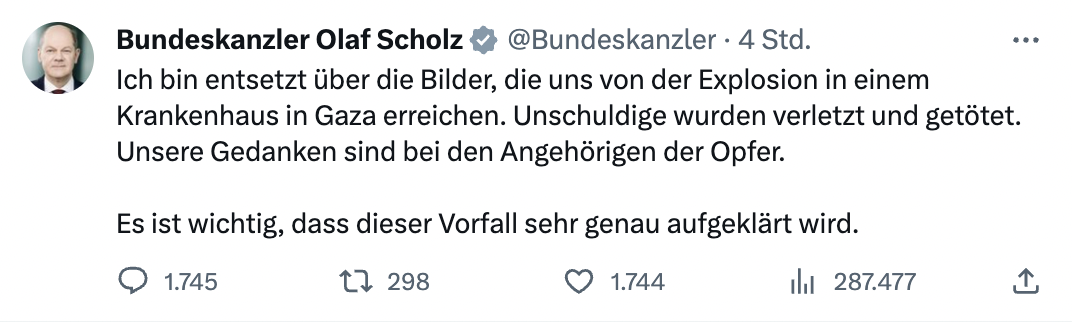 Am Dienstag schlägt eine Rakete in ein Krankenhaus in Gaza ein. Hunderte Menschen sollen gestorben sein! Jetzt äußert sich der deutsche Bundeskanzler dazu.