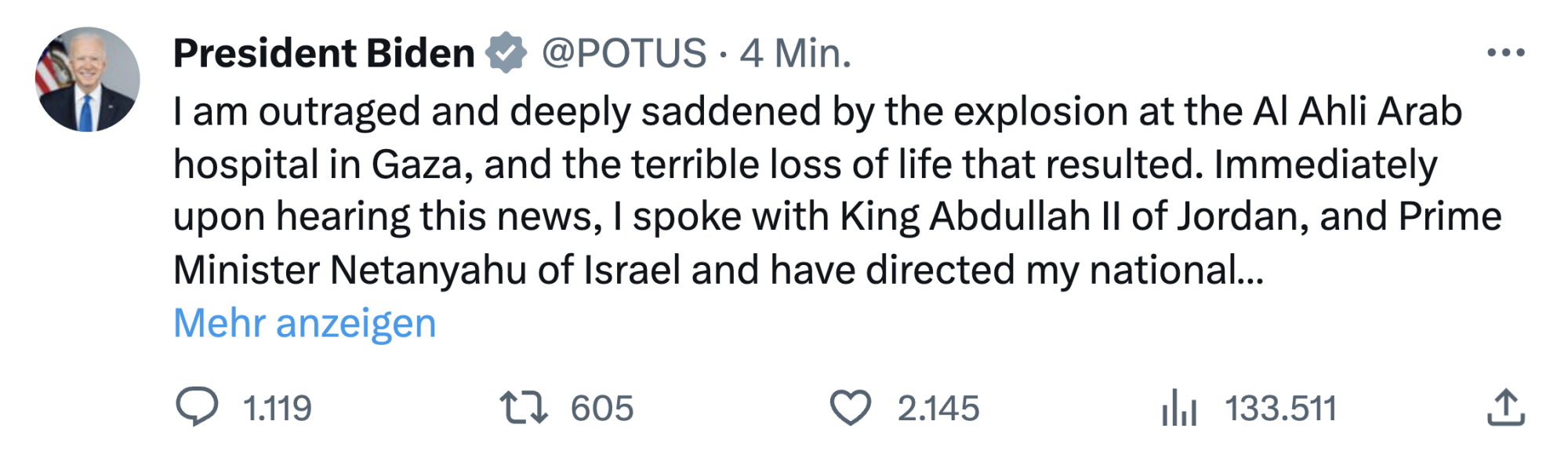 „Ich bin empört und zutiefst traurig über die Explosion im Al Ahli Arab-Krankenhaus in Gaza und den schrecklichen Verlust an Menschenleben, der daraus resultierte.