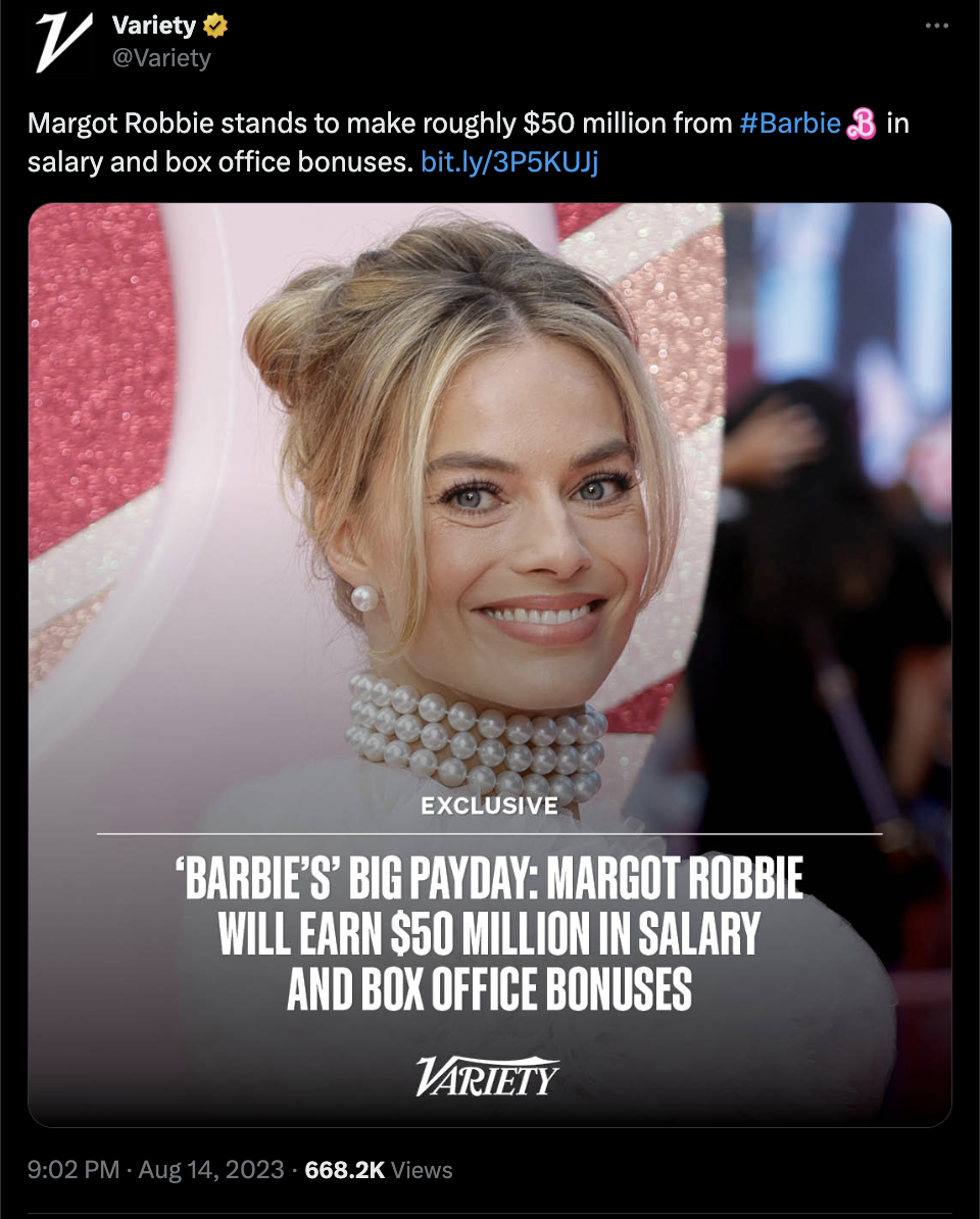 Insgesamt hat „Barbie“ fast 1,2 Milliarden Dollar eingebracht. Margot Robbie bekommt davon stolze 50 Millionen Dollar!