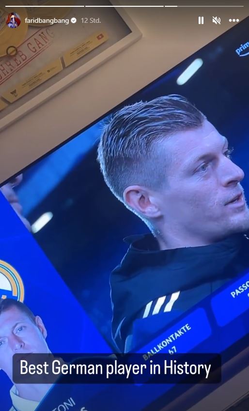 Sagt zumindest Farid! Beim CL-Spiel zwischen Chelsea und Real Madrid postet der 36-Jährige eine Instagram-Story von Kroos bei einem Interview: